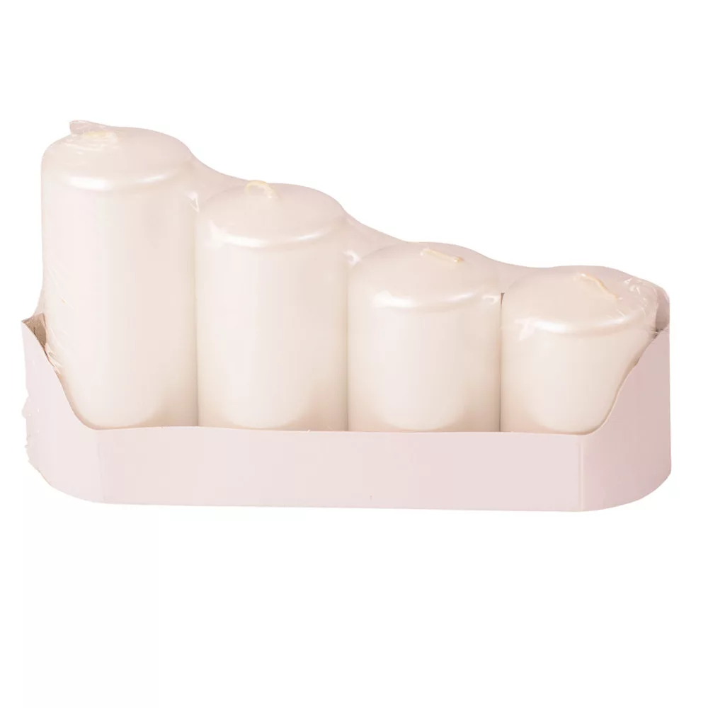 Stupňovitá adventná sada valcových sviečok, Ø50 x 70/80/100/120mm - Metalická perleťová biela