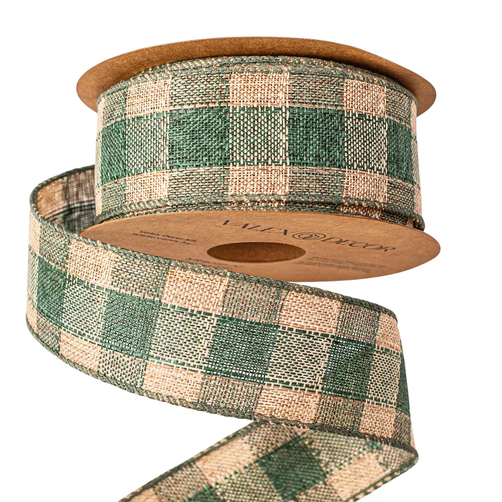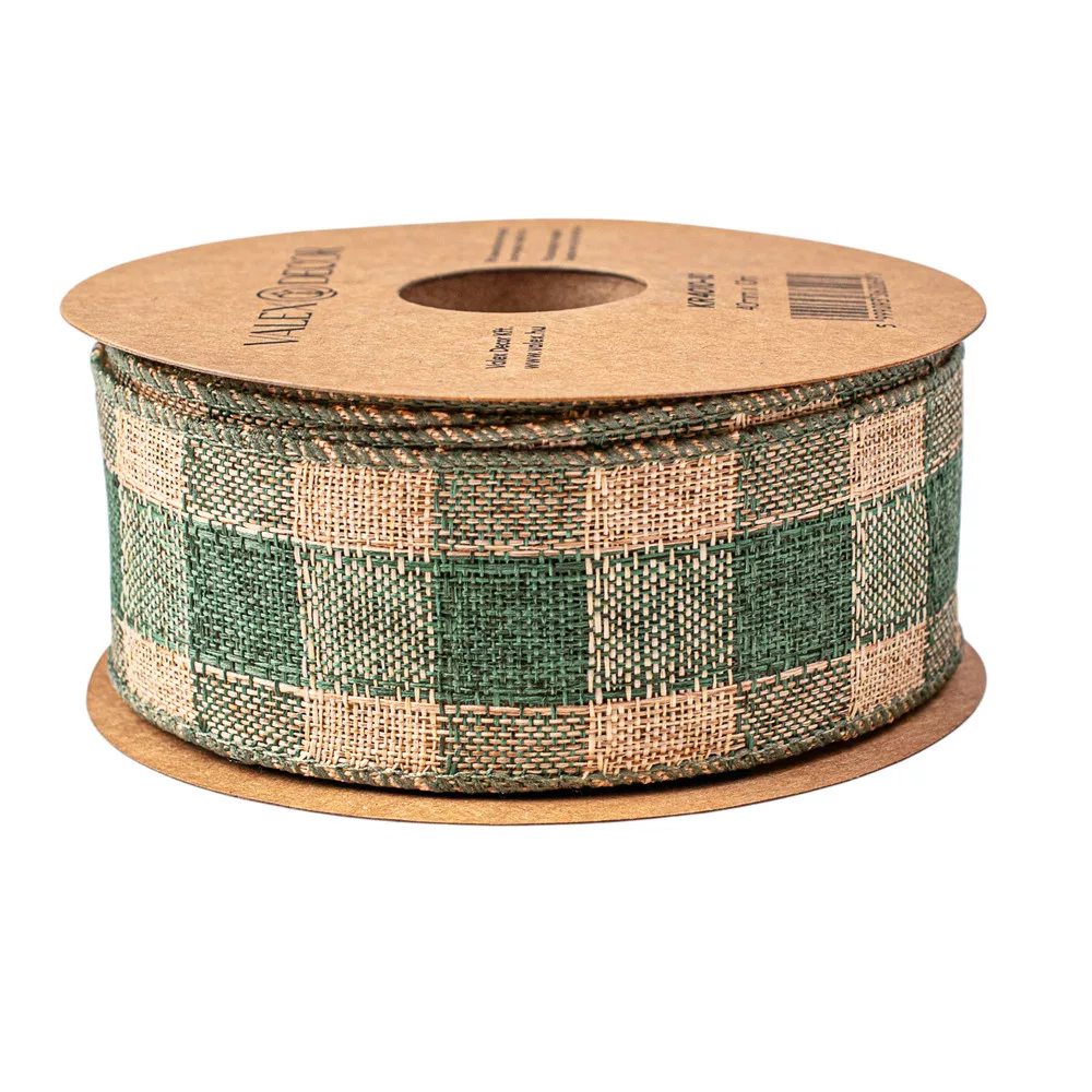 Károvaná ľanová stuha s drôtovým lemom 40mm x 10m - Zelená/Ecru