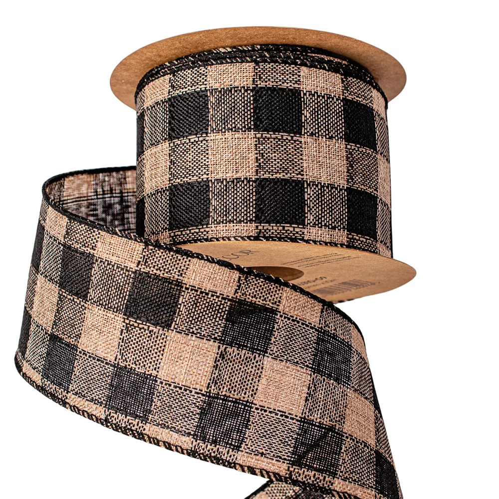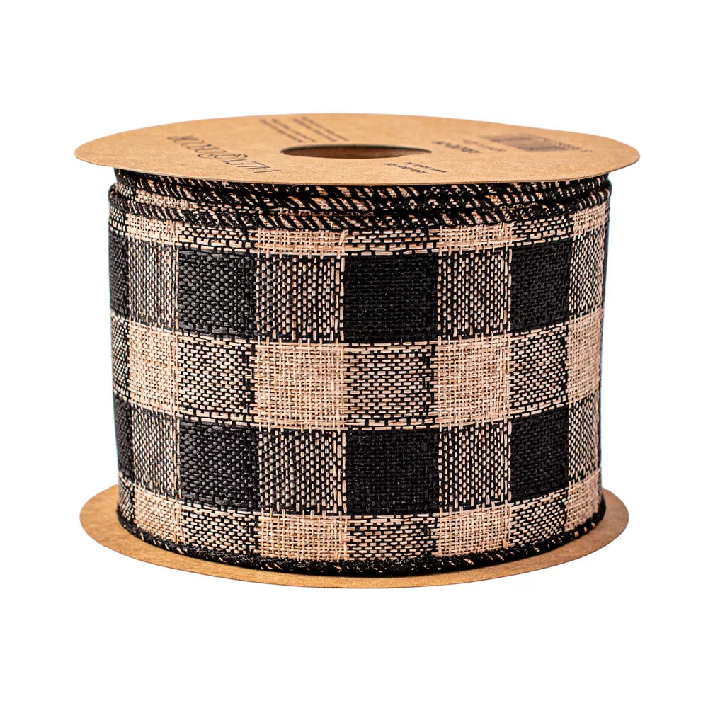 Károvaná ľanová stuha s drôtovým lemom 63mm x 10m - Čierna/Ecru