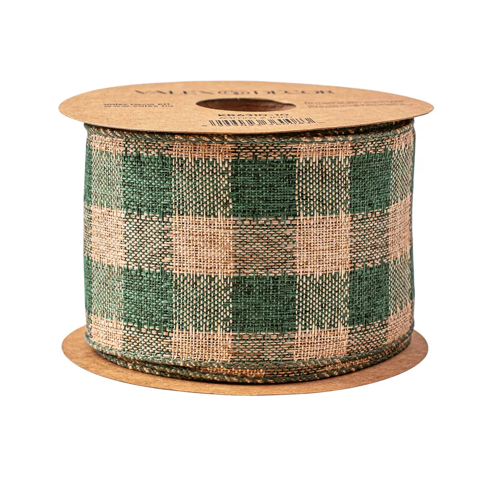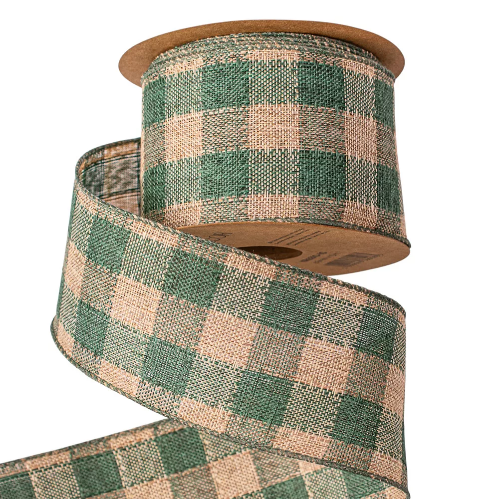 Károvaná ľanová stuha s drôtovým lemom 63mm x 10m - Zelená/Ecru